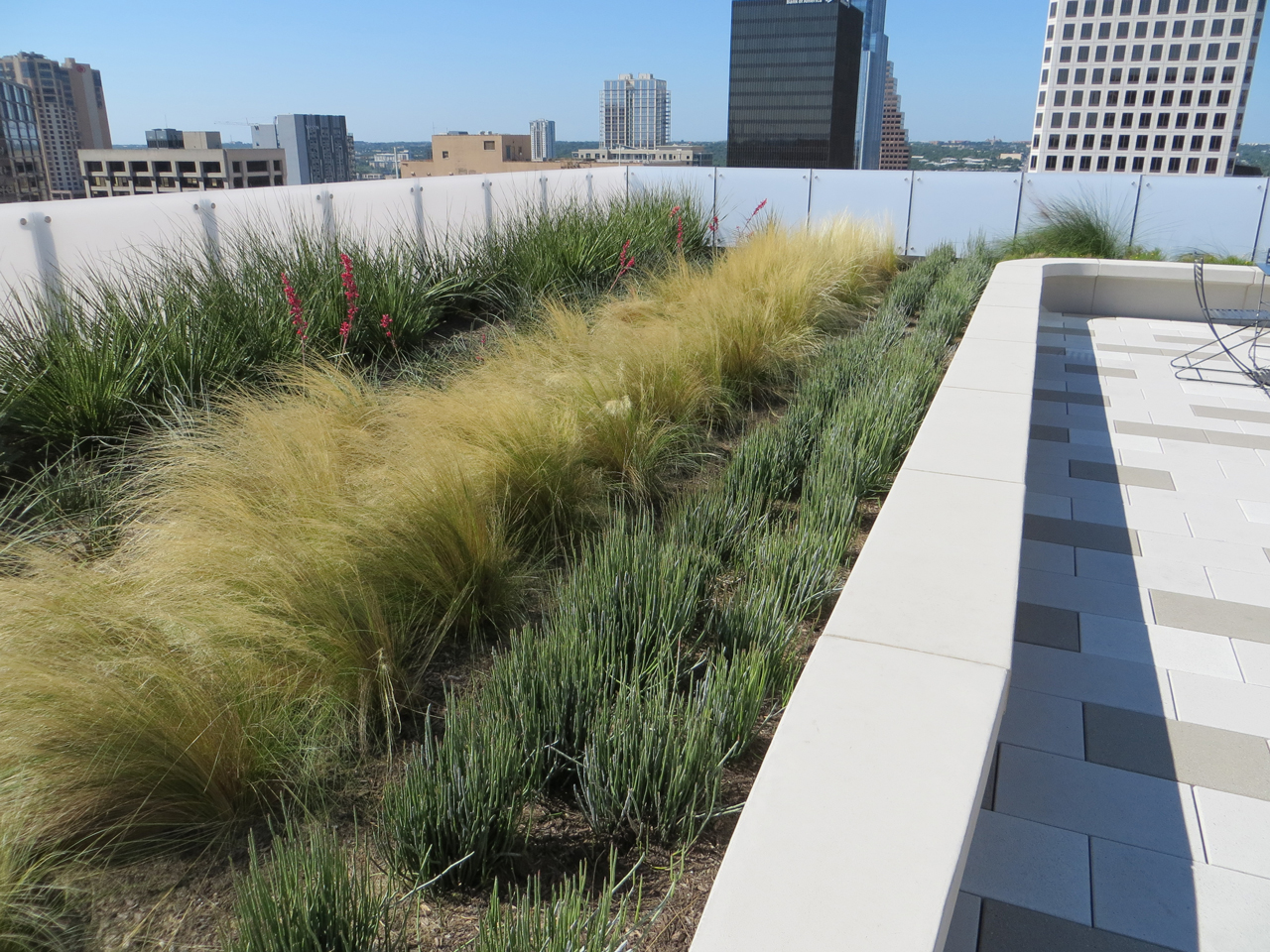 The design and construction team at 816 Congress in downtown Austin, TX transformed existing, inaccessible roof space into green roof amenity space for the building tenants. The unsightly rooftop space was converted to usable space for tenants and offers an impressive event space with incredible views of the Texas State Capitol. To accommodate the extra load of the new amenity space, an elevated steel deck was installed.